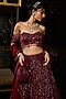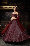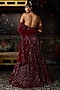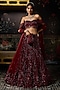 Diyarajvvir presents a maroon lehenga in tulle base with embellishments and cancan. It is paired with a blouse having 3D floral embellishments, a dupatta and a potli bag. Style this embellished lehenga with a diamond choker set, dewy makeup, and a sleek bun to highlight the neckline and intricate detailing. Perfect for bridal wear, engagement ceremonies, or opulent evening receptions.