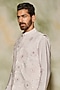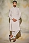 Featuring a blush pink kurta in cotton silk base with self on self thread, cutdana, and acrylic embroidered sun rays. It is paired with contrasting pants and a bundi jacket.