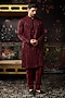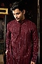 Featuring a maroon kurta in dola silk base with thread and cutdana embroidery. Style it up with pants, a stole, mojaris and a mala for a wedding or sangeet ceremony.