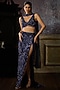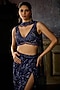 Featuring a midnight blue crop top in tulle base with abstract floral embroidery. It is paired with an embellished slit trail skirt and a choker dupatta. Accentuate it with statement earrings and heels for a wedding, sangeet or cocktail ceremony.
