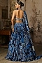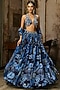 DiyaRajvvir features a navy blue lehenga in crepe base with coral veil print. It is paired with a blouse, a can-can and an organza printed dupatta having tassels detail. Style this lehenga with kundan jewellery, soft curls and embellished heels for an elegant look, perfect for engagement ceremonies, sangeet nights or daytime wedding functions.