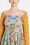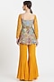 Featuring a pastel yellow peplum top in modal and georgette base with jaal print and sequins embroidery. It is paired with matching godet pants and a triangle bag.