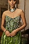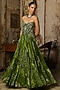 DiyaRajvvir features a pear green corset gown in crepe and organza base with coral veil print. Style this gown with meenakari jewellery, soft curls and embellished heels for an elegant look, perfect for sangeet nights or daytime wedding functions.