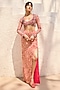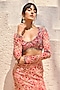 Diyarajvvir features a pink crop top in crepe base with asymmetric print. It is paired with a slit skirt. Accentuate it with heels and a clutch bag for a sangeet or cocktail ceremony.