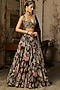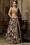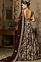 DiyaRajvvir features a plum lehenga in crepe and georgette base with featherfall print. It is paired with a blouse, a can-can and an organza printed dupatta. Style this lehenga with kundan jewellery, soft curls and embellished heels for an elegant look, perfect for engagement ceremonies, sangeet nights or daytime wedding functions.