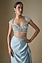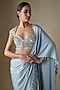 Featuring a powder blue pre-draped skirt saree in tulle and armani satin base. It is paired with an embellished blouse. Accentuate it with zircon jewellery and heels for a sangeet or cocktail ceremony.
