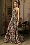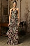 DiyaRajvvir features a plum corset in crepe and georgette base with featherfall print. It is paired with a printed skirt and a potli bag. Style it with meenakari earrings, heels and a clutch for sangeet, roka, engagement or wedding festivities.