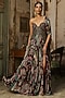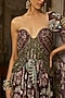 DiyaRajvvir features a plum and olive green slit corset gown in tulle and georgette base with embroidery. It is paired with a detachable drape. Style this gown with meenakari jewellery, soft curls and embellished heels for an elegant look, perfect for sangeet nights or daytime wedding functions.