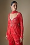 Featuring a red peplum in net and shantoon base with abstract embroidery. It is paired with embroidered sharara pants and an embroidered scalloped dupatta. Accentuate it with zircon jewellery and heels for a wedding or sangeet ceremony.