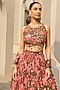 Featuring a sage green lehenga in crepe and georgette base with floral print. It is paired with a printed blouse and a dupatta. Accentuate it with polki jewellery and strappy heels for festive occasions, mehendi ceremony or daytime weddings.