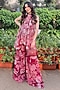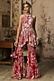 DiyaRajvvir features a scarlet red peplum top in crepe and georgette base with coral veil print. It is paired with printed bell-bottom pants having and a potli bag. Style it with meenakari earrings, heels and a clutch for sangeet, roka, engagement or wedding festivities.