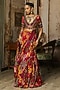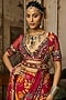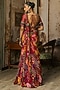 DiyaRajvvir features a deep red mermaid saree in tulle and georgette base with coral veil print. It is paired with a printed blouse and a belt. Style it with meenakari earrings, heels and a clutch for sangeet, roka, engagement or wedding festivities.