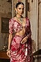 DiyaRajvvir features a scarlet red draped saree in crepe and georgette base with coral veil print. It is paired with a printed blouse. Style it with meenakari earrings, heels and a clutch for sangeet, roka, engagement or wedding festivities.