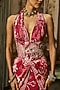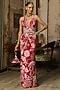 DiyaRajvvir features a scarlet red maxi dress in crepe base with coral veil print. It is paired with a belt and a potli bag. Style this gown with meenakari jewellery, soft curls and embellished heels for an elegant look, perfect for sangeet nights or daytime wedding functions.