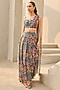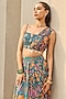 Featuring a teal asymmetric blouse in crepe and georgette base with floral print. It is paired with a printed draped skirt. Accentuate it with polki jewellery and strappy heels for festive occasions, mehendi ceremony or daytime weddings.