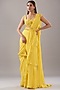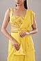 Featuring a yellow ruffled saree in cotton silk and georgette base. It is paired with a blouse having cutdana embroidery, an embroidered belt and a triangle bag. Accentuate the designer saree set with statement earrings and heels for a wedding or an engagement ceremony.