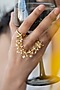Featuring a 22kt gold plated handcrafted adjustable ring studded with kundan polki and pearls, set in mixed metal. Perfect choice for festive celebrations, wedding or sangeet ceremonies.