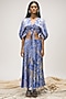Featuring an indigo blue and silver grey front knotted top in viscose orient slub satin base with raglan kimono sleeves.