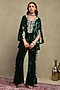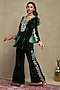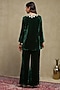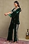 Featuring a forest green top in silk velvet base with embroidery. It is paired with flared trousers. Accentuate it with dangler earrings and flats for a festive occasion, intimate pooja ceremony or family gathering.