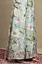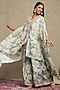 Featuring a light turquoise cape in luxe chanderi base with print and embroidery. It is paired with a viscose bustier and flared trousers. Accentuate it with minimal jewellery and heels for a festive occasions or wedding ceremony.