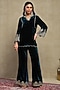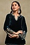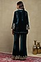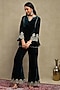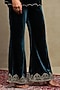 Featuring a midnight blue top in silk velvet base with embroidery. It is paired with flared trousers. Accentuate it with statement earrings and heels for an evening look.