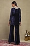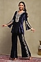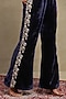 Featuring a navy blue top in silk velvet base with embroidery. It is paired with flared trousers. Accentuate it with dangler earrings and flats for a festive occasion, intimate pooja ceremony or family gathering.