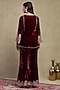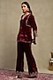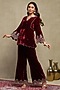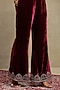 Featuring a plum top in silk velvet base with embroidery. It is paired with flared trousers. Accentuate it with statement earrings and heels for an evening look.