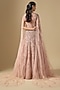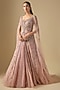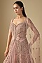 Featuring a baby pink jacket in shimmer net base with hand embroidery. It is paired with a skirt. Style it with swarovski or zircon jewellery, sleek low bun and embellished heels, perfect for a cocktail, wedding, engagement or sangeet ceremony.