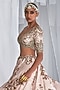 Featuring a beige ombre lehenga in raw silk base with embroidery. It is paired with a matching blouse and a tulle dupatta.