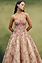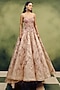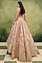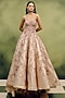 Featuring a beige and gold ball gown in organza tissue base with motif hand embroidery. Style it with statement jewellery and embellished heels, perfect for a cocktail or sangeet ceremony.