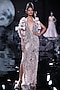 Featuring a blush ivory column gown in tulle base with a crystallized cutwork. Accentuate the look with a headband and heels.