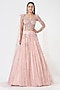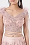 Featuring a blush pink lehenga in raw silk base with hand embroidery. It is paired with a matching blouse with exaggerated sleeves and a belt.
