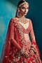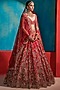 Featuring a carmine red lehenga in raw silk base with zardosi, multi-colored parsi thread, and floral motifs embroidery. It is paired with a matching encrusted blouse, a belt, a tulle veil, and a dupatta.