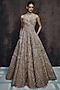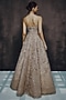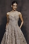 Featuring a champagne gold ball gown in organza base with sequins, floral and crystal hand embroidery. Accentuate it with zircon or swarovski jewellery, embellished heels and a clutch for gala dinners, sangeet nights or cocktail ceremony.
