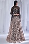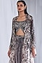 Featuring a charcoal grey ombre jacket in organza base. It is paired with a matching chiffon tissue corset and sharara pants.