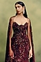 Featuring a cherry red corset in georgette base with tassels and beads hand embroidery. It is paired with a skirt and a cape. Style it with statement jewellery and embellished heels, perfect for an engagement, cocktail or sangeet ceremony.
