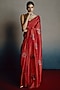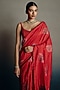 Featuring a crimson red handwoven saree in pure banarasi silk base with motif embellishments. It is paired with a textured embroidered blouse and an underskirt. Style this exquisite ensemble with emerald polki jewellery, a classic maang tikka and a soft dewy makeup to complete the look, perfect for a wedding or engagement ceremony.