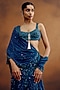 Featuring a deep teal skirt in georgette base with crystal embellishment and hand embroidery. It is paired with a blouse and a drape. Style it with statement dangler earrings and embellished heels, perfect for a cocktail, wedding, engagement or sangeet ceremony.