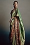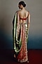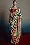 Featuring a green and red saree in banarasi silk base with zari hand embroidery. It is paired with a textured embroidered blouse and an underskirt. Style this exquisite ensemble with emerald polki jewellery, a classic maang tikka and a soft dewy makeup to complete the look, perfect for a wedding or engagement ceremony.