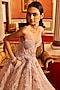 Dolly J features a mesmerizing Nude Gown that captivates with its elegance. The eye-catching piece is crafted in shimmer tulle with zardosi embroidery. It is paired with a can-can. Accessorize the designer gown with statement earrings and heels for cocktail parties, showcasing style and sophistication.