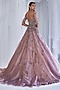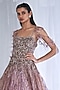 Featuring a lavender gown in tissue organza base with feather tassels. It is paired with a matching leather embellished belt and a cancan.