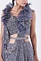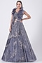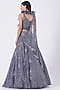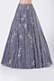 Featuring a leaden blue lehenga in chiffon base with chikankari embroidery. It is paired with a matching blouse, a belt, and a shimmer tulle dupatta.