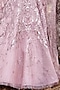 Featuring a lilac bridal gown in shimmer tulle base with feathers and flowy sleeves. It is paired with a matching leather belt and a cancan.