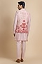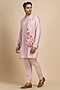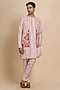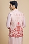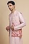 Featuring a baby pink bundi jacket in raw silk base with embroidery. It is paired with cotton silk trousers and a dupion silk kurta. Style it with mojaris for a festive occasion, wedding, sangeet or engagement ceremony, exuding traditional charm and elegance.
