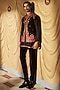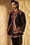 Featuring a black bundi jacket in japanese crepe base with kashmiri thread hand embroidery. It is paired with a silk dupion kurta and pants. Style it with classic mojaris and a pocket square for a refined look, ideal for wedding functions or festive gatherings.