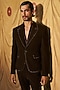 Featuring a black tuxedo jacket in japanese crepe base with crystal detailing. It is paired with a georgette pleated shirt having a V-neckline and pants. Style it with leather shoes for a sophisticated ensemble, ideal for cocktail parties or evening receptions.