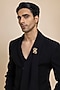 Featuring a black tuxedo in japanese crepe base. It is paired with trousers and a metallic brooch. Style it with shoes for a cocktail evening, reception, sangeet, wedding or engagement ceremony.