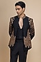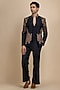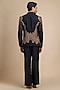 Featuring a black short open jacket in raw silk base with tonal motifs and hand embroidery. It is paired with a crepe shirt and cotton silk trousers. Style it with mojaris for a reception, sangeet or engagement ceremony.