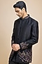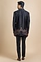 Featuring a black open jacket in raw silk base. It is paired with a dupion silk shirt and japanese crepe trousers. Style it with mojaris for a festive occasion, reception, sangeet, wedding or engagement ceremony, exuding traditional charm and elegance.