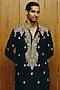 Featuring a black kurta in silk base with embroidery. It is paired with beige cotton silk pants. Style it with a pair of loafers and a bracelet for daytime weddings, engagement or sangeet functions.